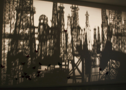 The iron tower of the work is scenery of the oil rigs of LA.? The building of the dome at the center of the work is an atomic bomb memorial in Hiroshima. Japan became the atomic-bombed nation of two times due to the war and the earthquake.The butterfly means the reproduction, so this butterfly is wishing the reproduction of Japan.